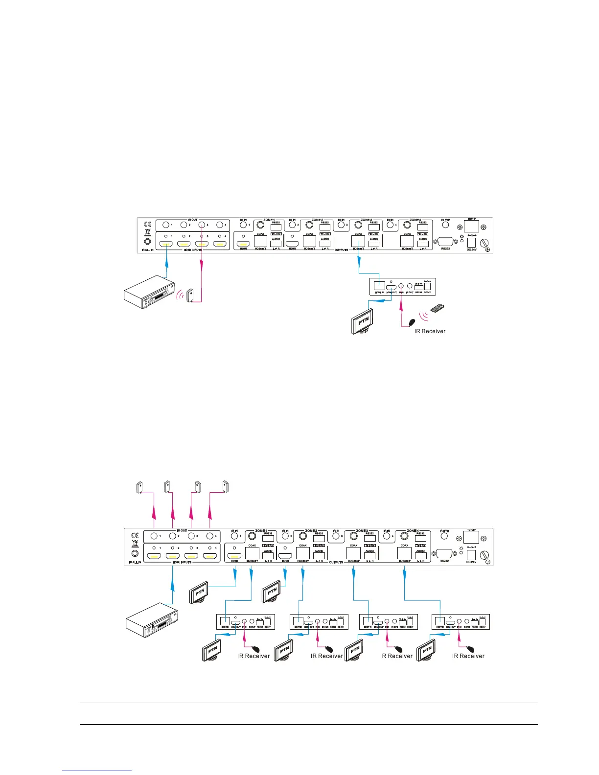 Connect IR receiver(s) to IR IN on far-end HDBT receiver(s), and IR Emitter(s) to IR
