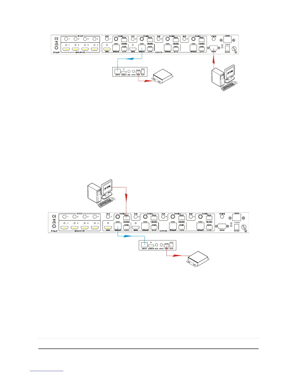Connect the RS232 (3-pin pluggable terminal block) port in any zone to controlled
