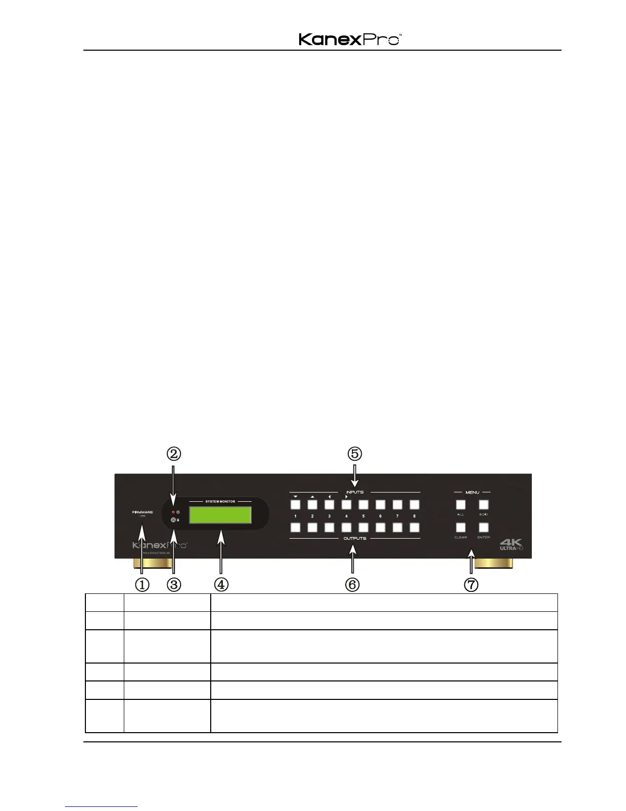 KanexPro MX-HDBASE8X8-4K - Package List; 2 Product Appearance of the 4 K Hdbaset 8 X8 Matrix Switcher; Front Panel
