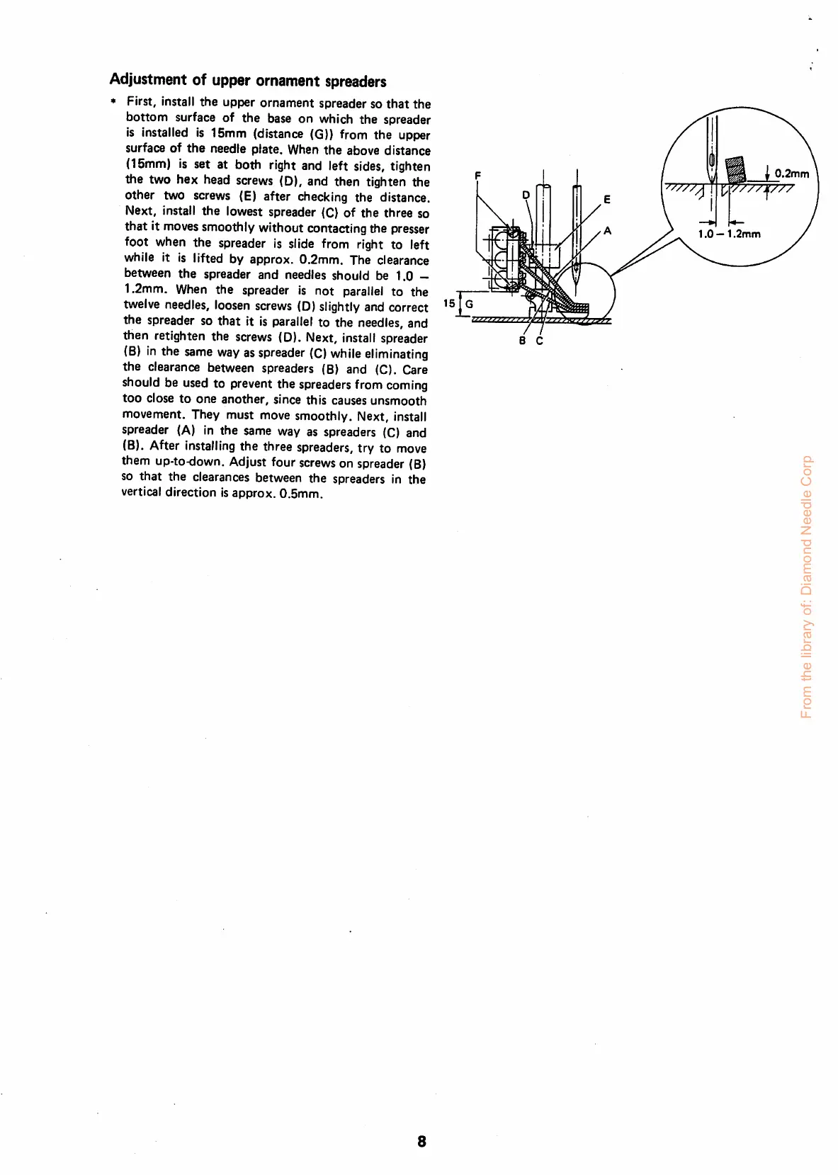 the clearance between spreaders (8) and (C). Care