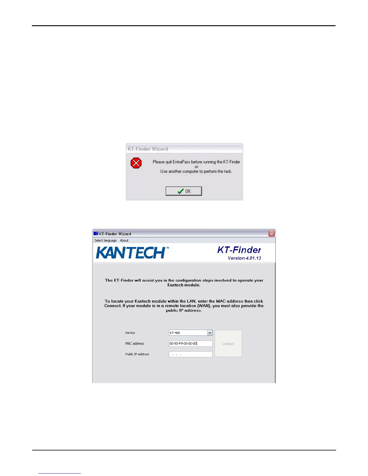 Note: If you try to run the KT-Finder while running EntraPass, you will get an error message similar to this.