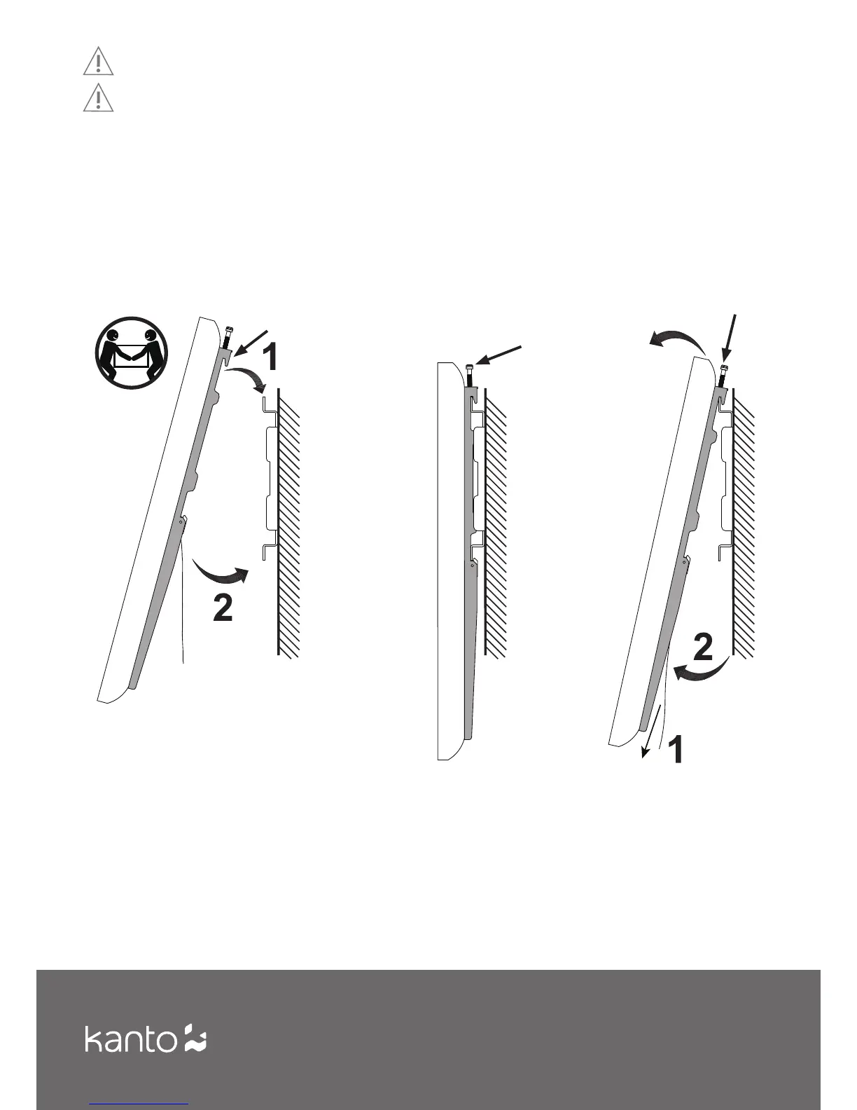 With the TV brackets firmly secured to the TV, use two people to lift the TV into position and hook the TV brackets onto