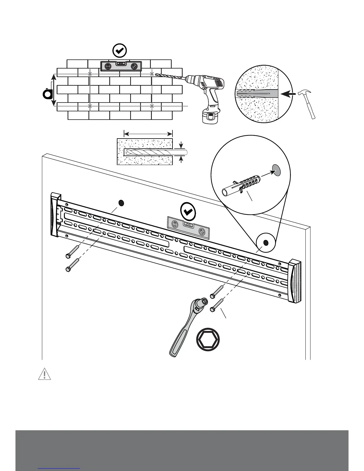 Assurez-vous que le mur en béton ou en brique est d’au moins 4” d’épaisseur. Assurez-vous que l’ancre est complètement ras avec la surface du béton, même s’il y a