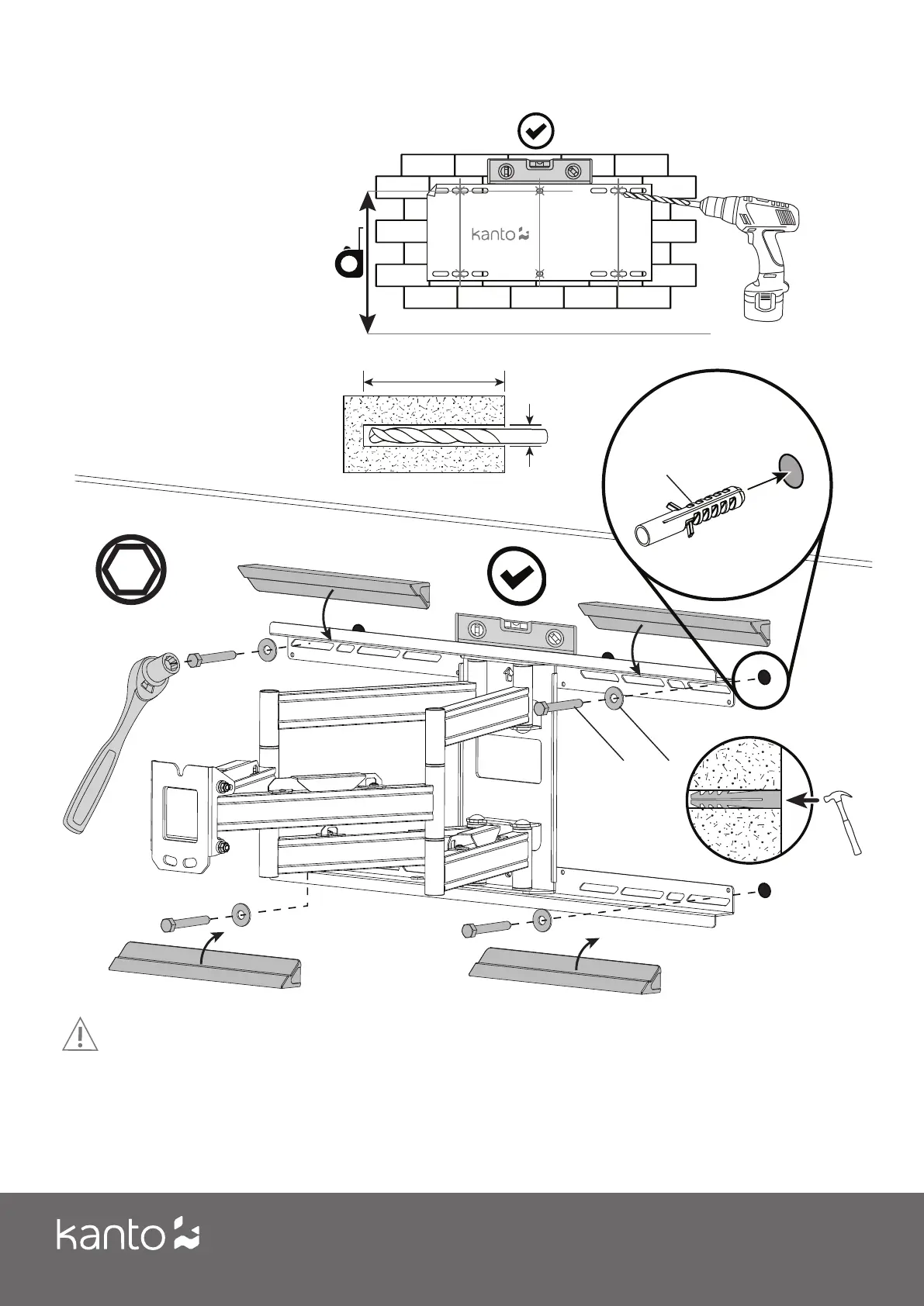 Assurez-vous que le mur en béton ou en brique est d’au moins 4” d’épaisseur. Assurez-vous que l’ancre est complètement ras avec la surface du béton, même s’il y a