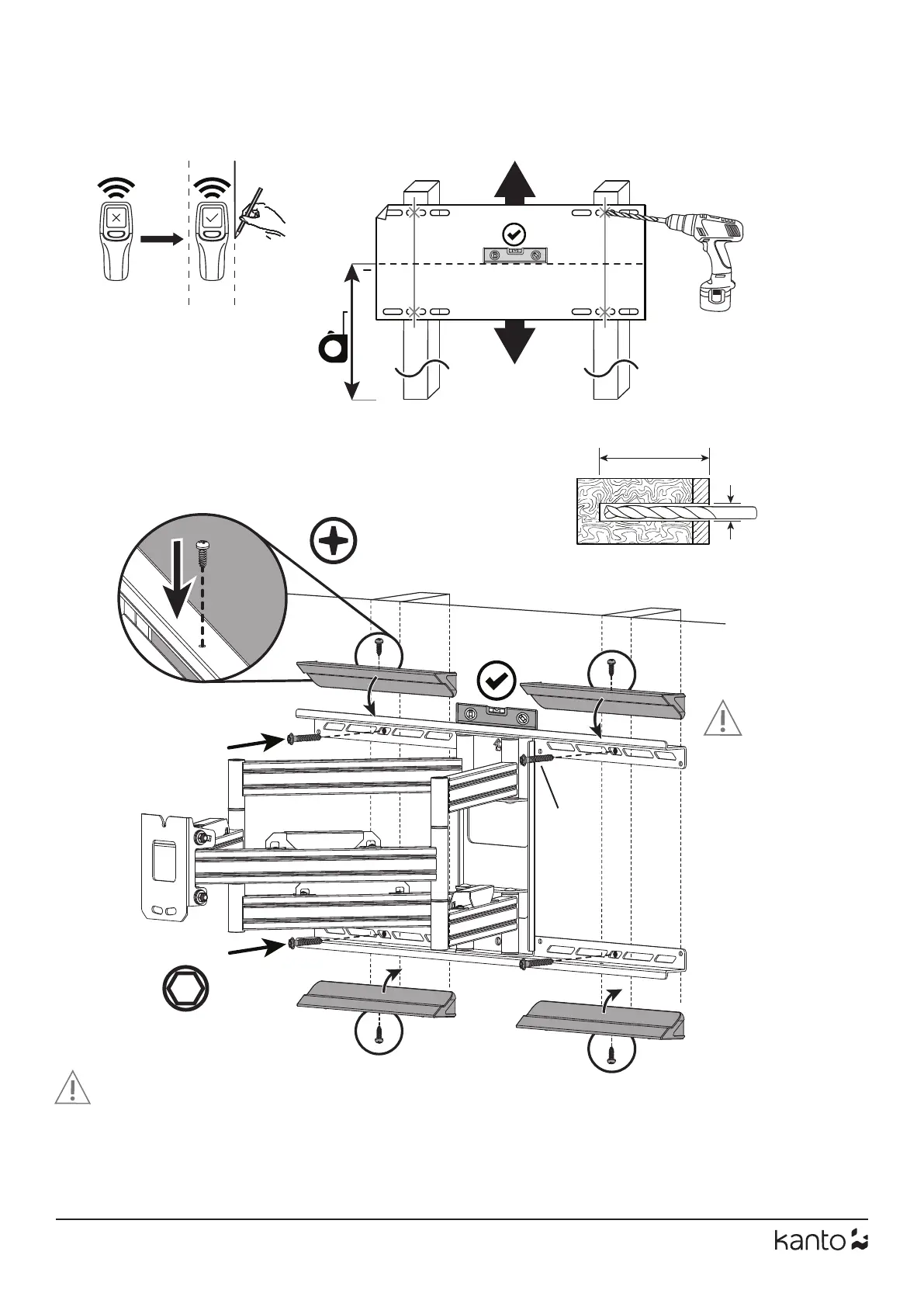 Assurez-vous que la surface porteuse supporte la limite de poids mentionnée dans les acertissements de précaution en bas de la page deux. Serrez les vis tire-