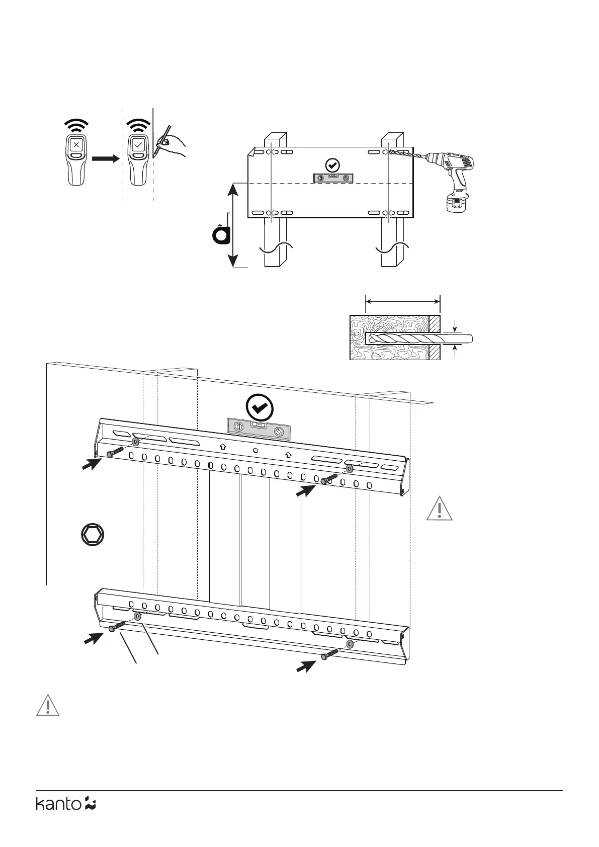 Assurez-vous que la surface porteuse supporte la limite de poids mentionnée dans les acertissements de précaution en bas de la page deux. Serrez les vis tire-
