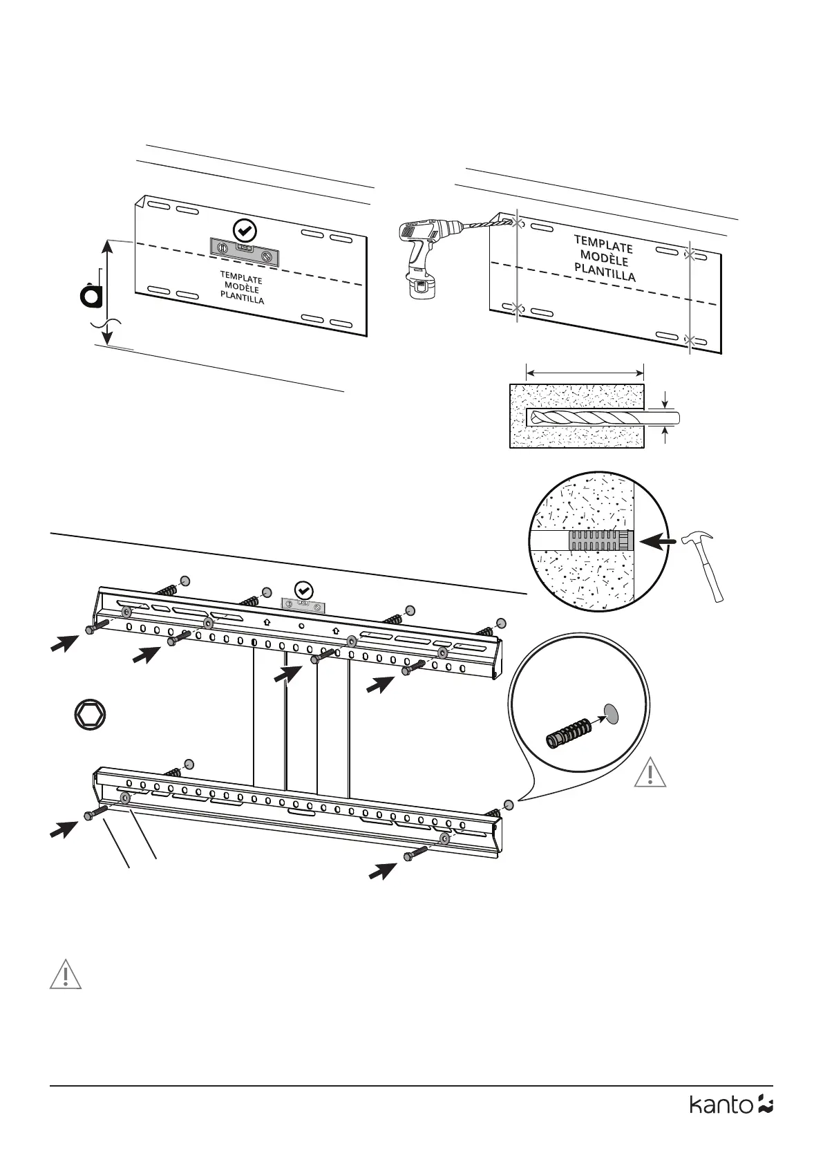 Assurez-vous que le mur en béton ou en brique est d’au moins 4” d’épaisseur. Assurez-vous que l’ancre est complètement ras avec la surface du béton,