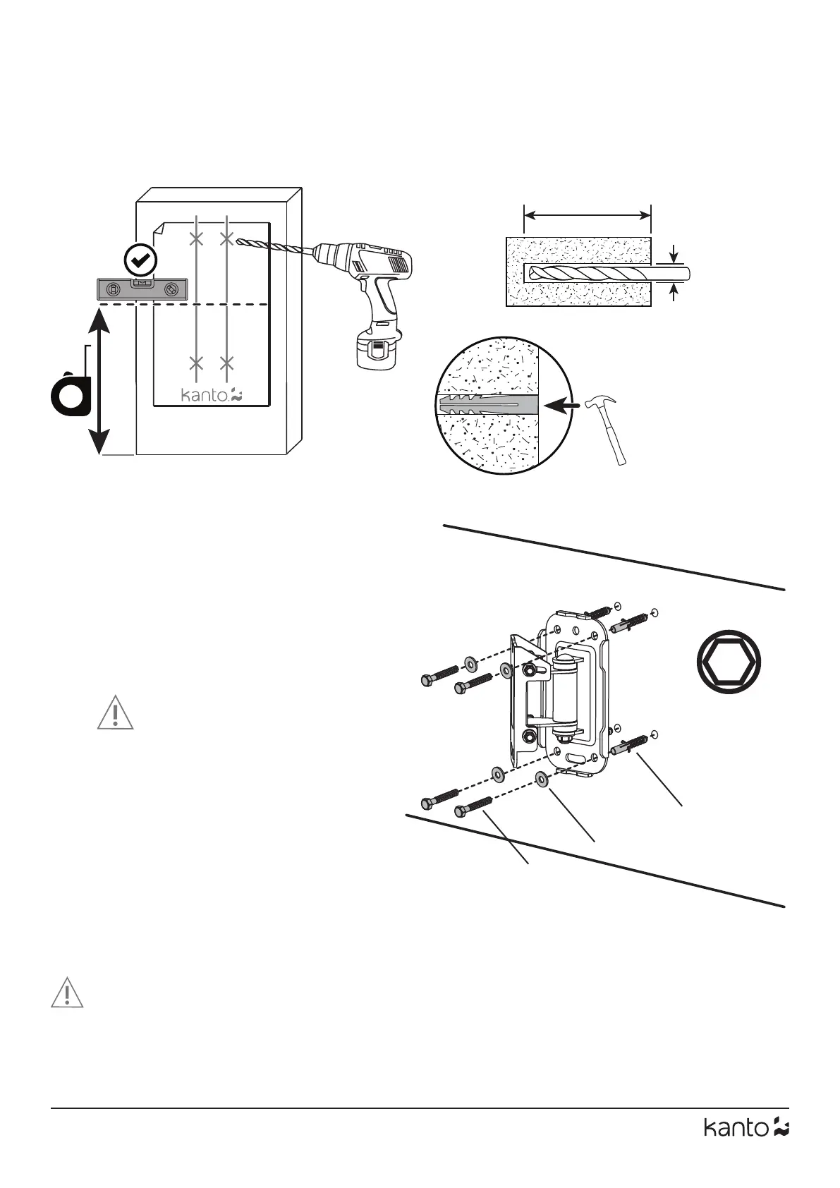 Assurez-vous que le mur en béton ou en brique est d’au moins 4” d’épaisseur. Assurez-vous que l’ancre est complètement ras avec la surface du béton,