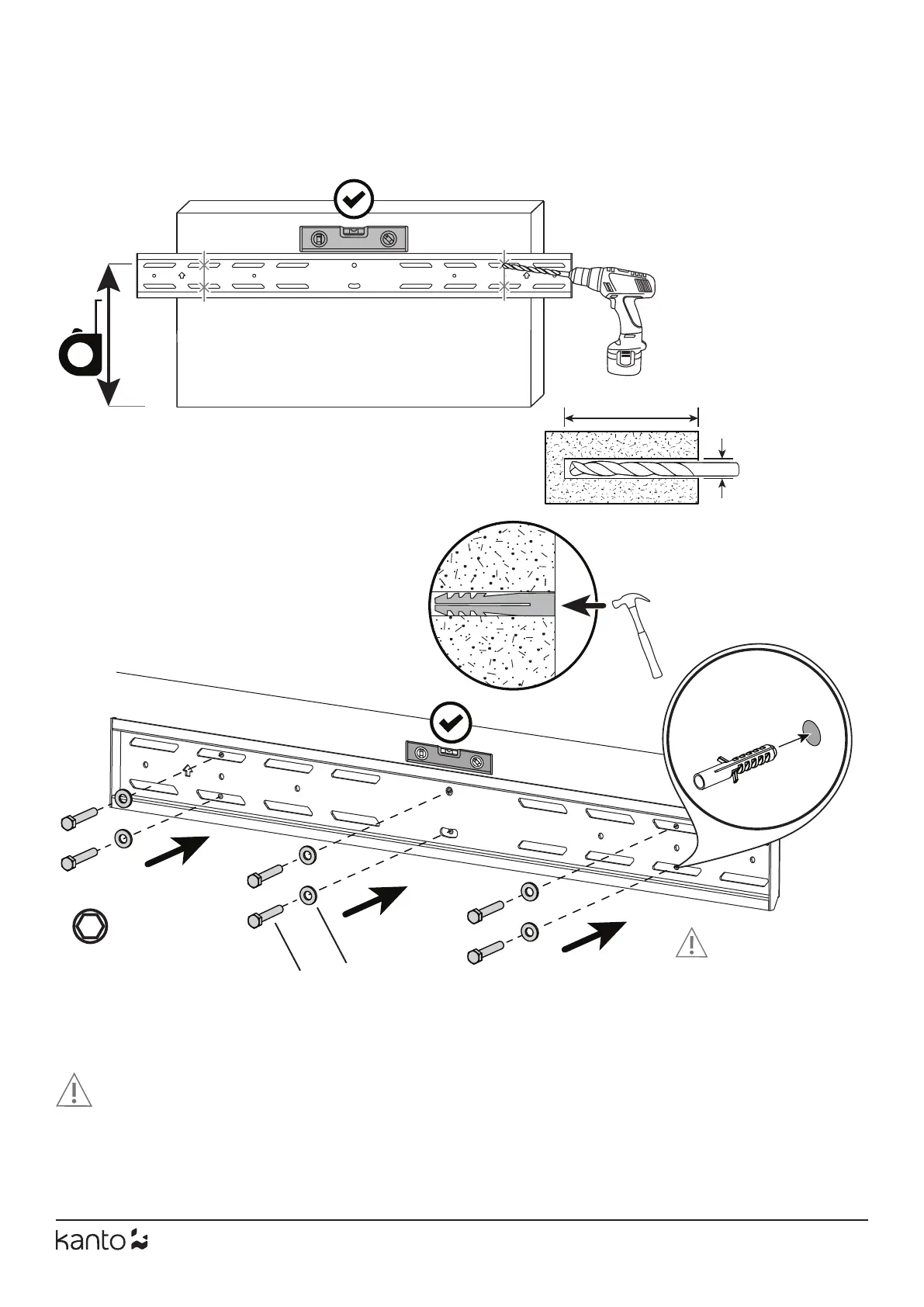 Assurez-vous que le mur en béton ou en brique est d’au moins 4” d’épaisseur. Assurez-vous que l’ancre est complètement ras avec la surface du béton,