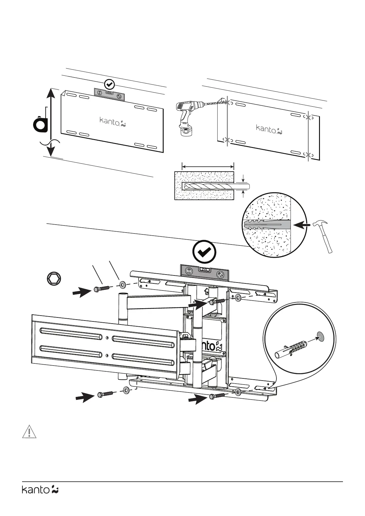 Assurez-vous que le mur en béton ou en brique est d’au moins 4” d’épaisseur. Assurez-vous que l’ancre est complètement ras avec la surface du béton,
