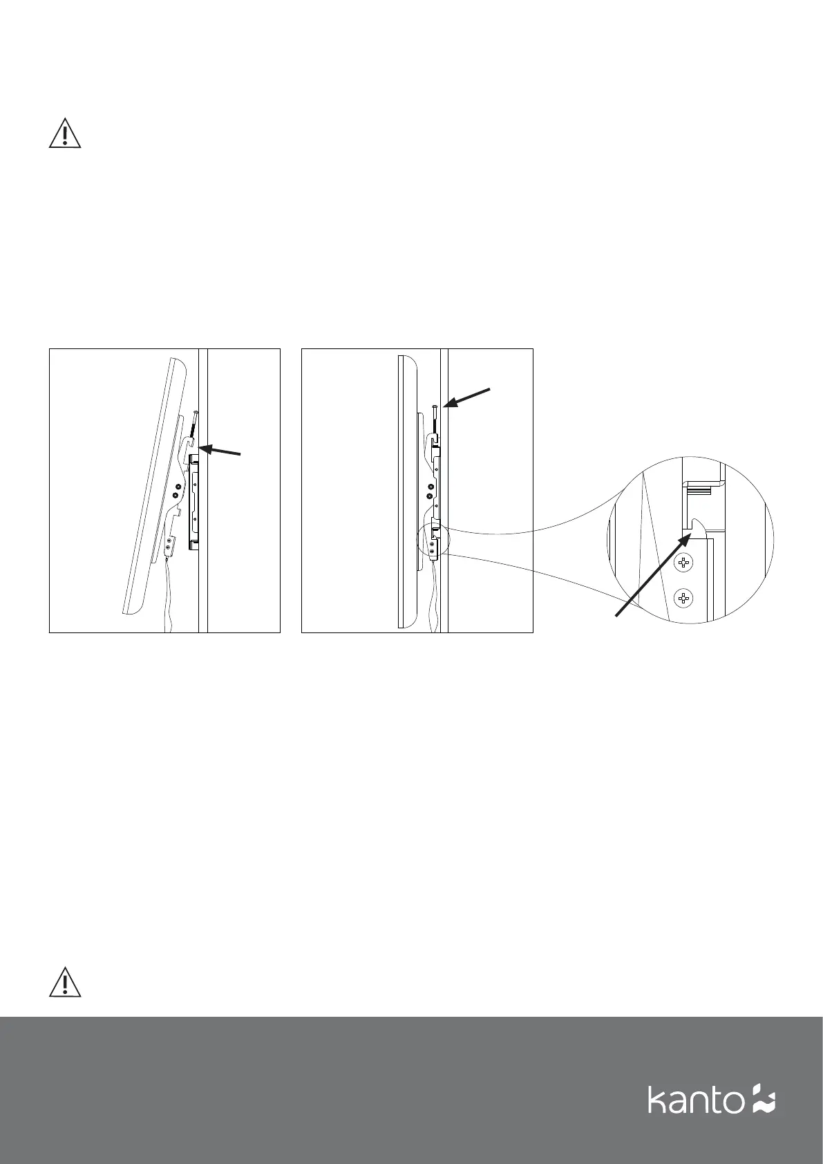 With the TV brackets fi rmly secured to the TV, use two people to lift the TV into position and hook the TV brackets