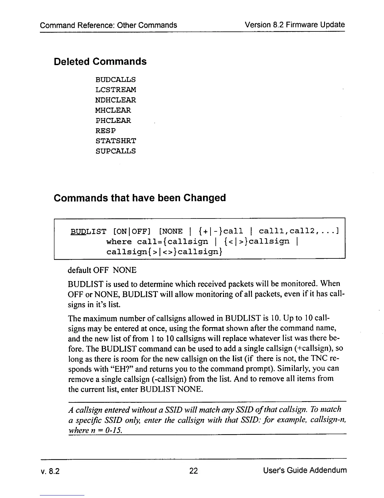 Kantronics KPC-3 - Deleted Commands List; Changed Commands Overview