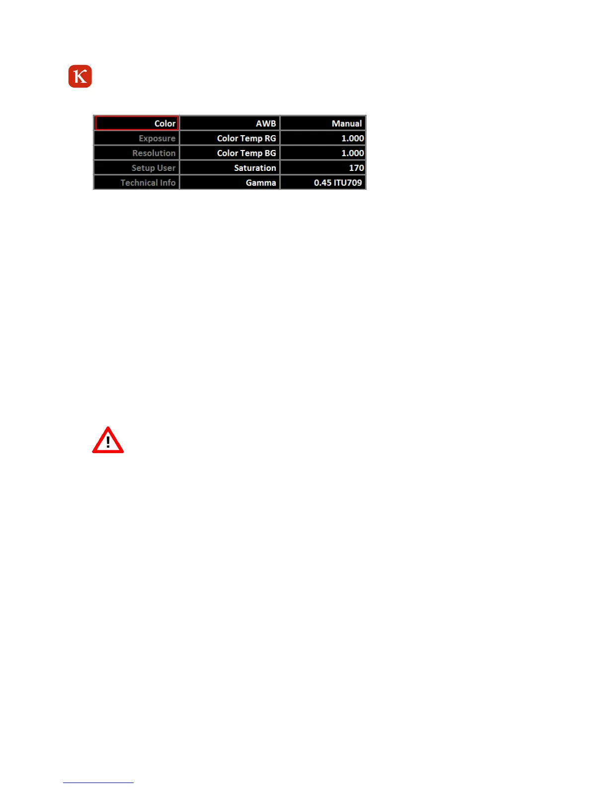 Here you can manually adjust the color temperature. You can only select these menu items if AWB is set to MANUAL. You