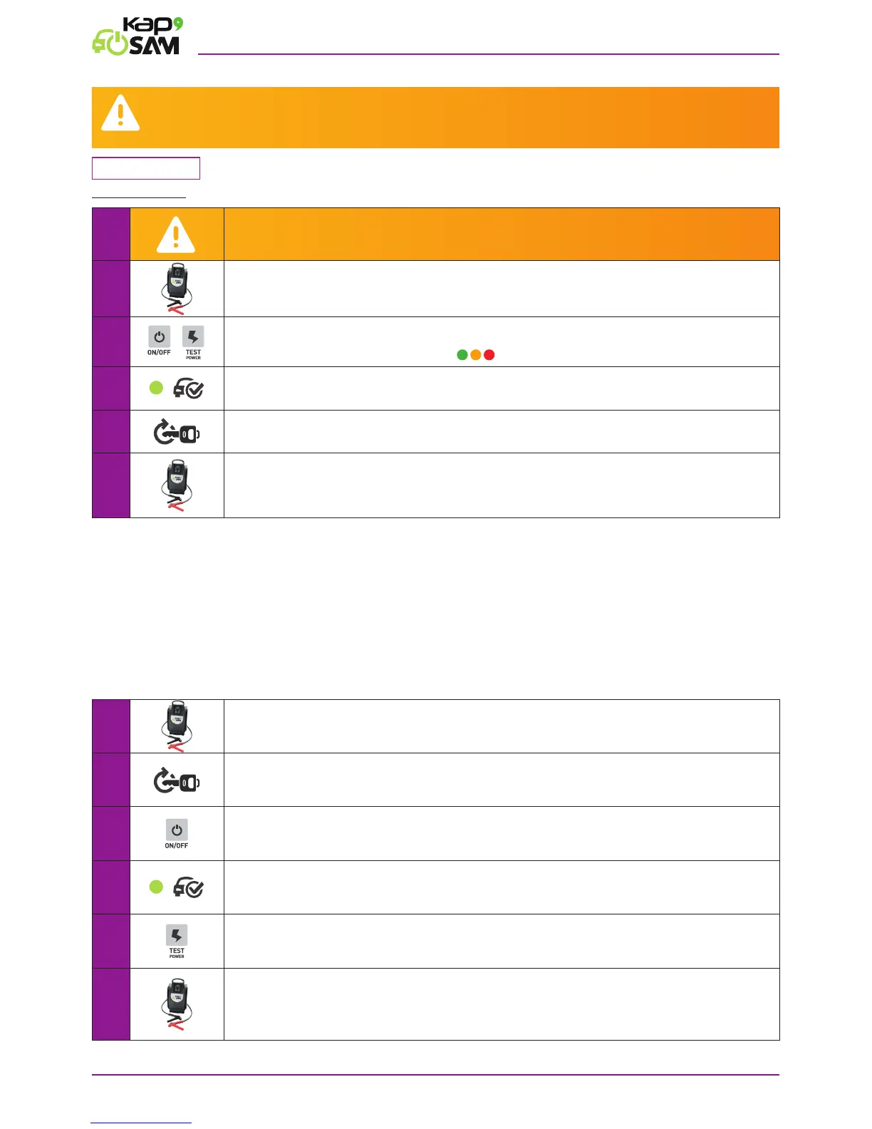 Conectai clemele dispozitivului Kap’SAM® la un vehicul funcional, respectând polarităile. Vehiculul nu trebuie