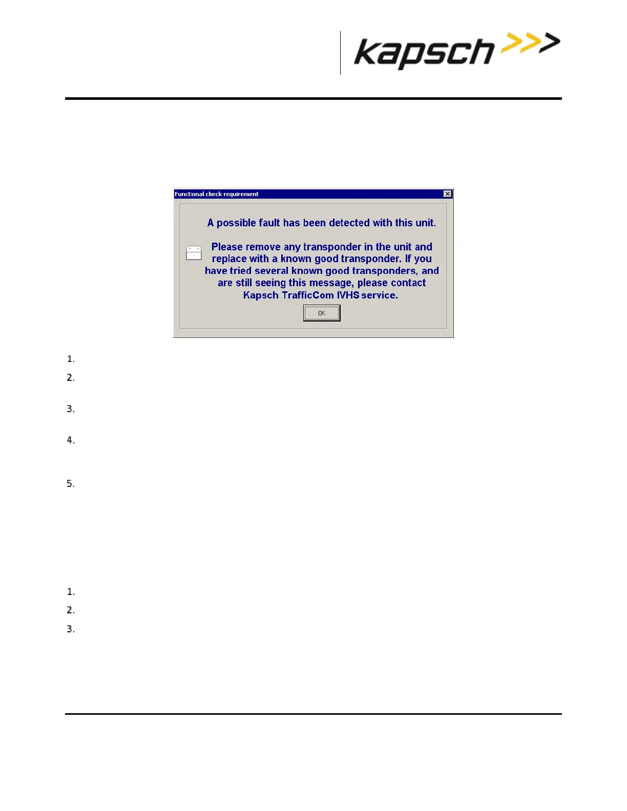 If the functional check requirement message appears after retesting three known good tags, contact Kapsch