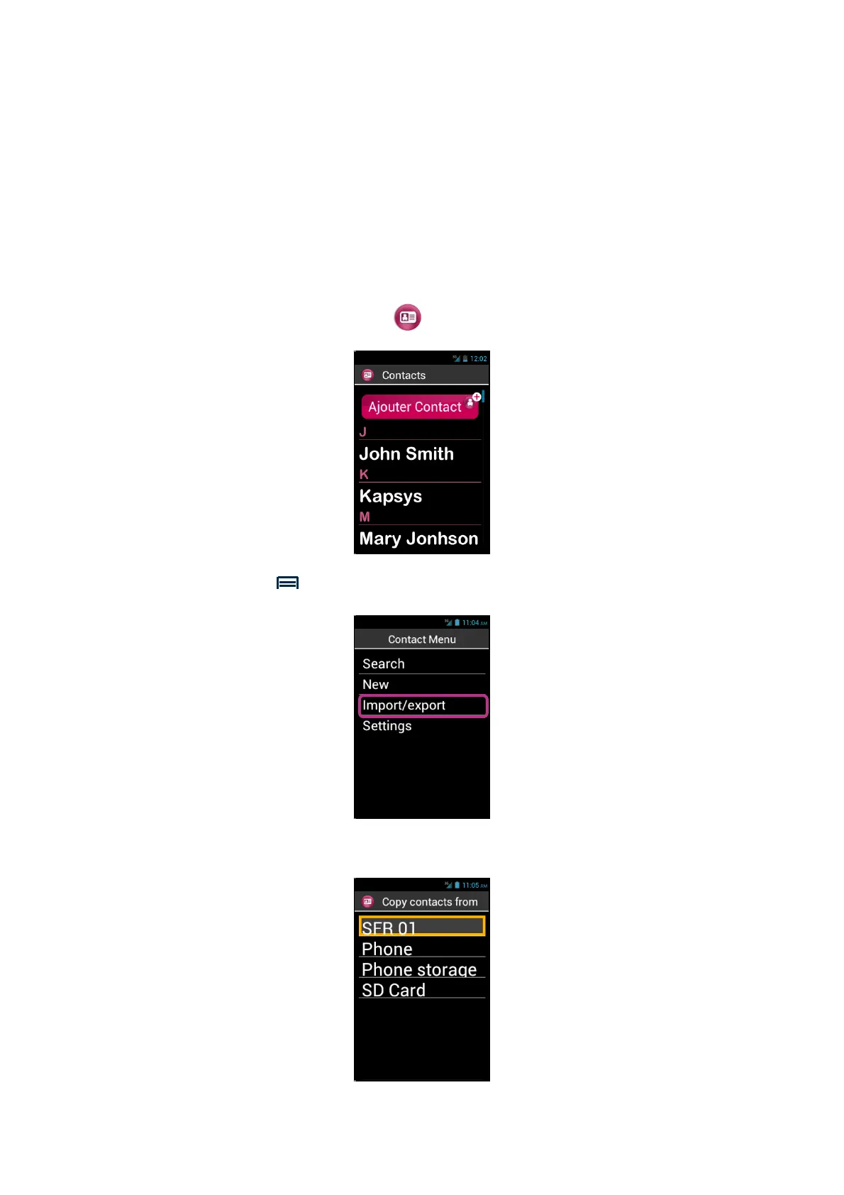 2. Press « Menu » key, then « Import/Export ».
