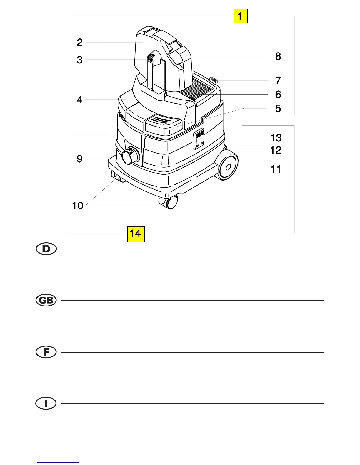 clapet protecteur 9. Raccord du flexible d'aspiration 14. Cuve de l'aspirateur