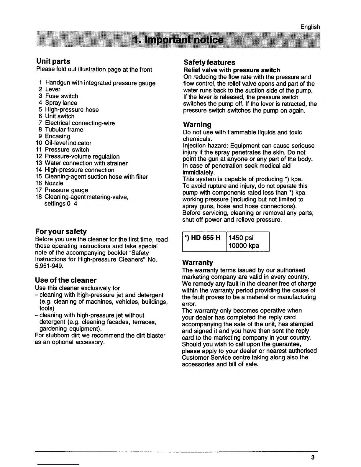 Kärcher HD 655 H - Important Notice; Safety Features; Warranty