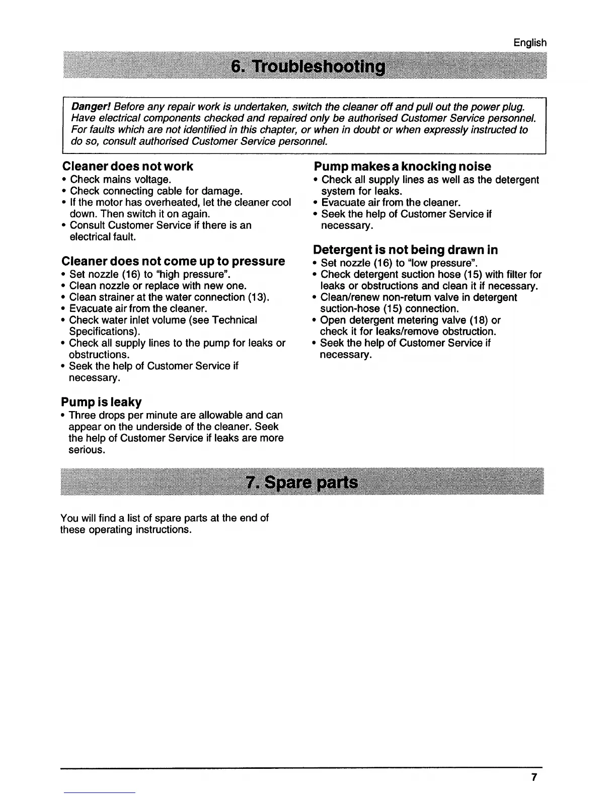 Kärcher HD 655 H - Troubleshooting; Power and Pressure Issues; Pump and Detergent Problems; Spare Parts Information