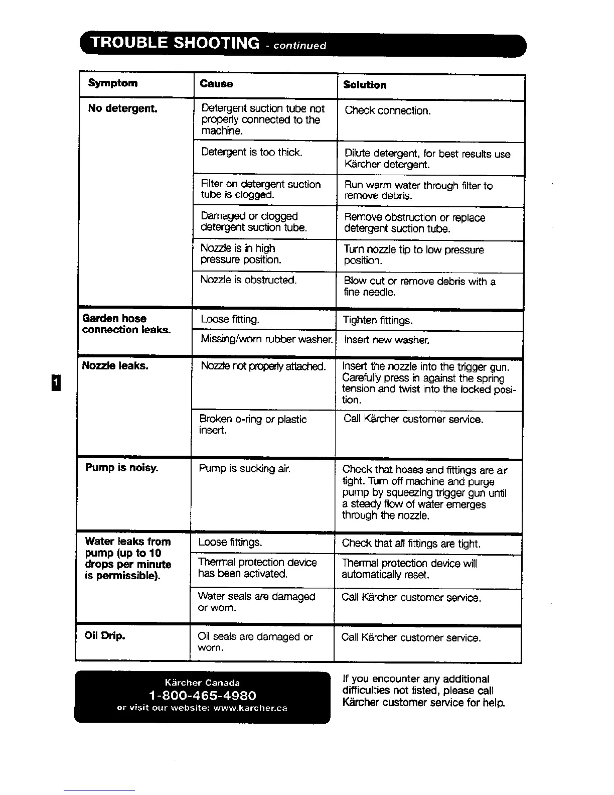Kärcher K 2301 - Troubleshooting Advanced Issues; Detergent Flow and Leak Problems; Pump Noise and Fluid Leaks