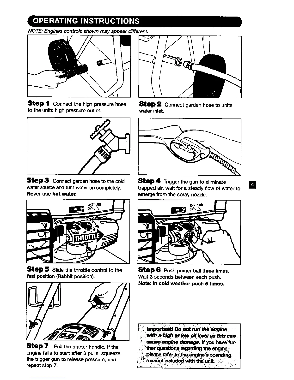 Kärcher K 2301 - Operating the Pressure Washer; Connecting Water and High-Pressure Hoses; Starting the Engine