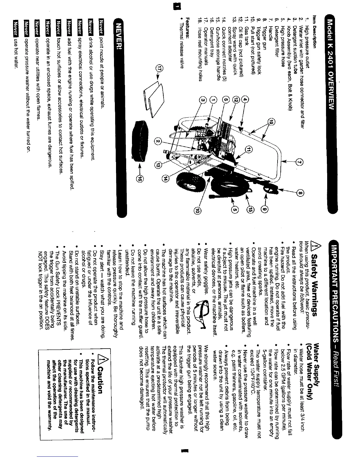 Kärcher K 2401 - Important Safety Precautions; General Safety Warnings; Water Supply Requirements; Operational Cautions and Notes