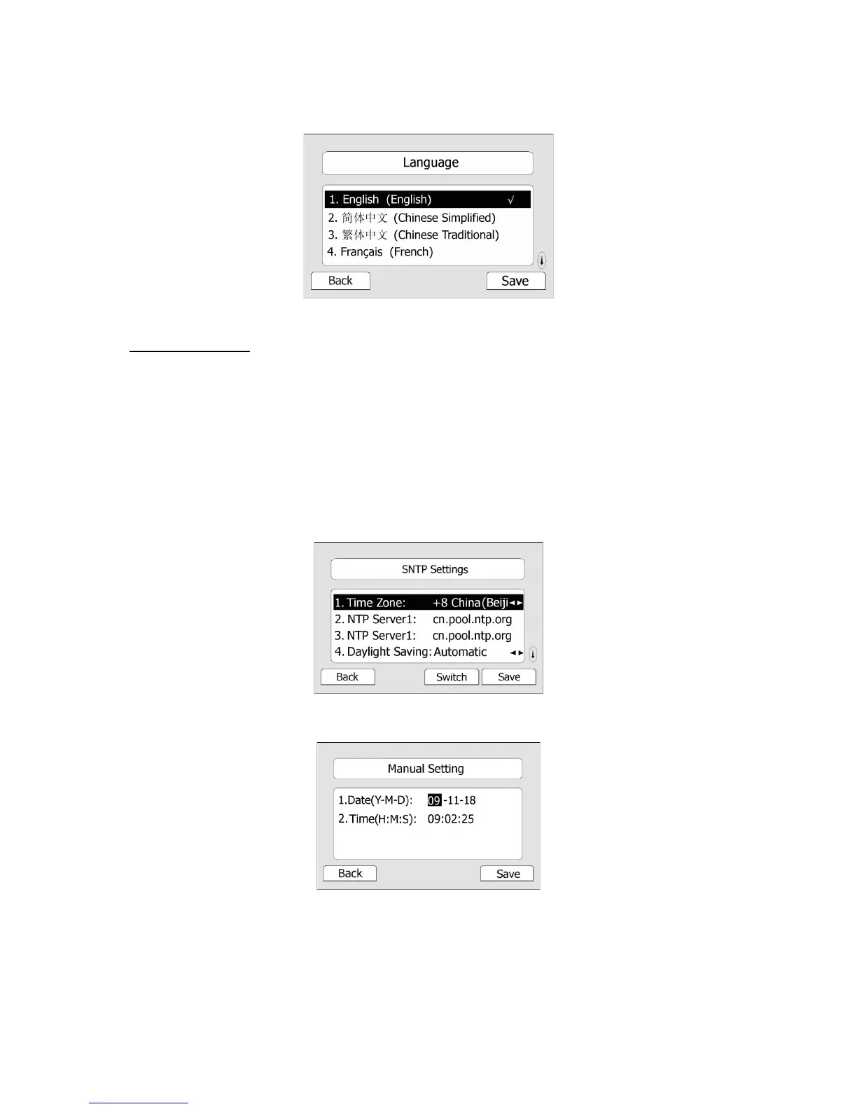 2) If SNTP Settings is chosen, the phone will automatically get the time from the specific NTP