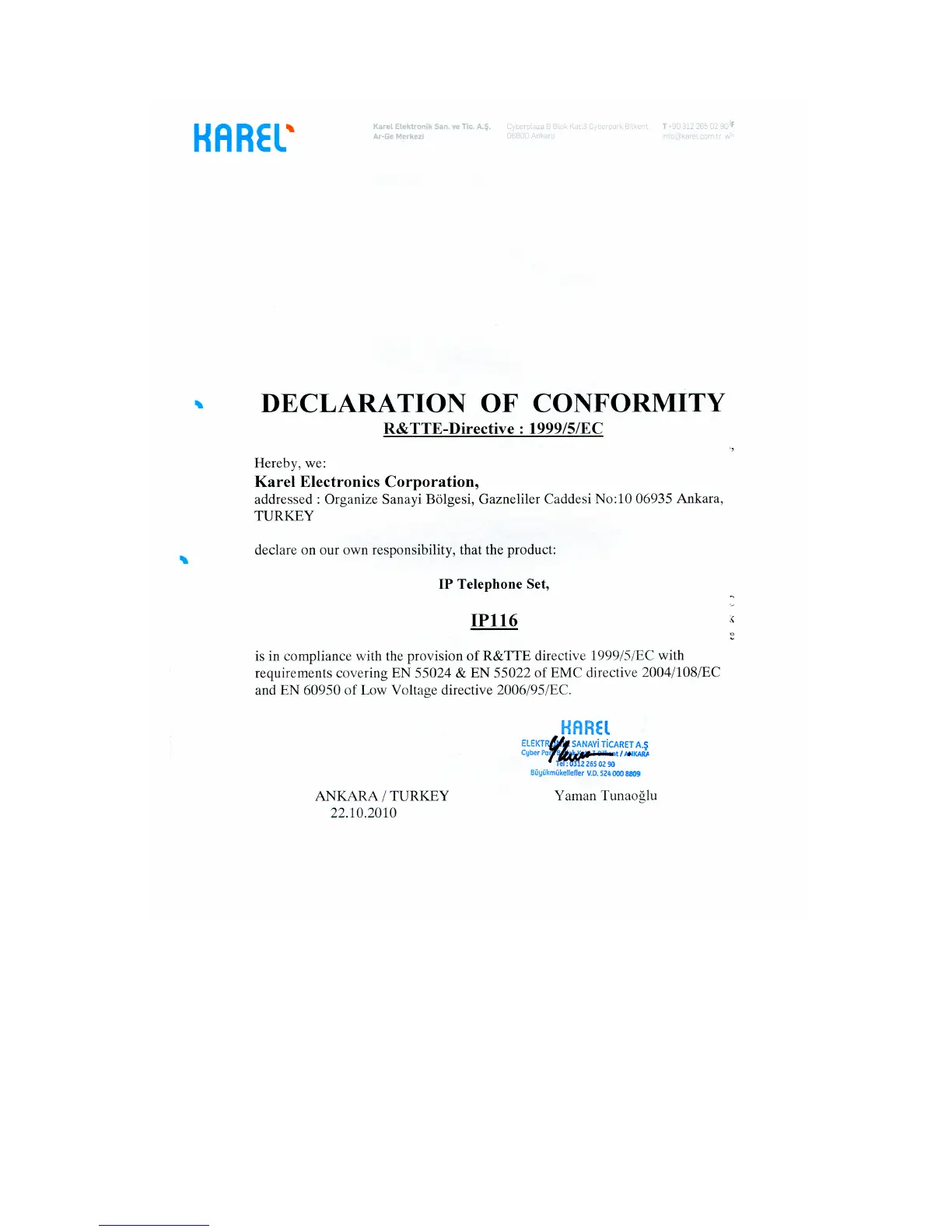 Karel IP116 - Declaration of Conformity