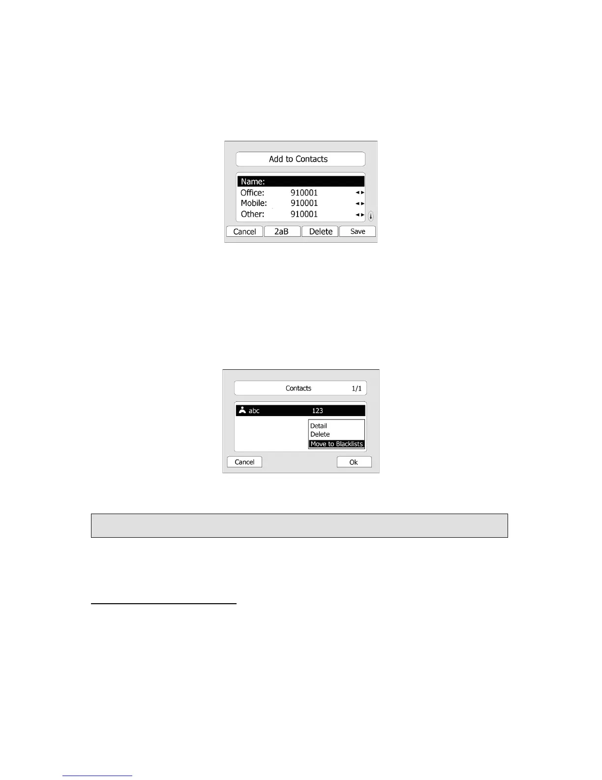 3) You can check the blacklist by pressing Directory->Blacklist->Enter to enter the