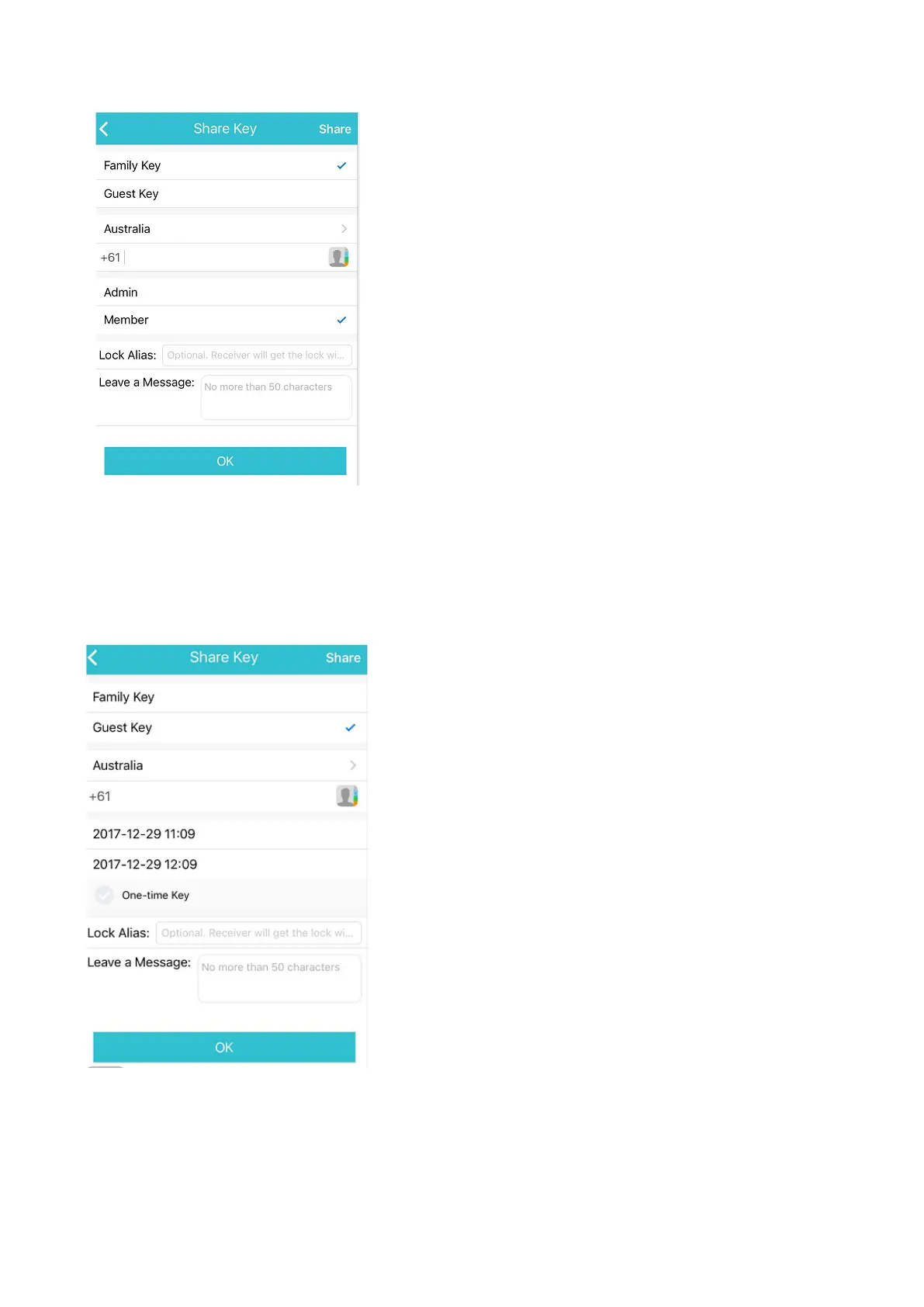 4.1.1.1 Share as Member: Input family member`s mobile number. Member key can unlock the door.
