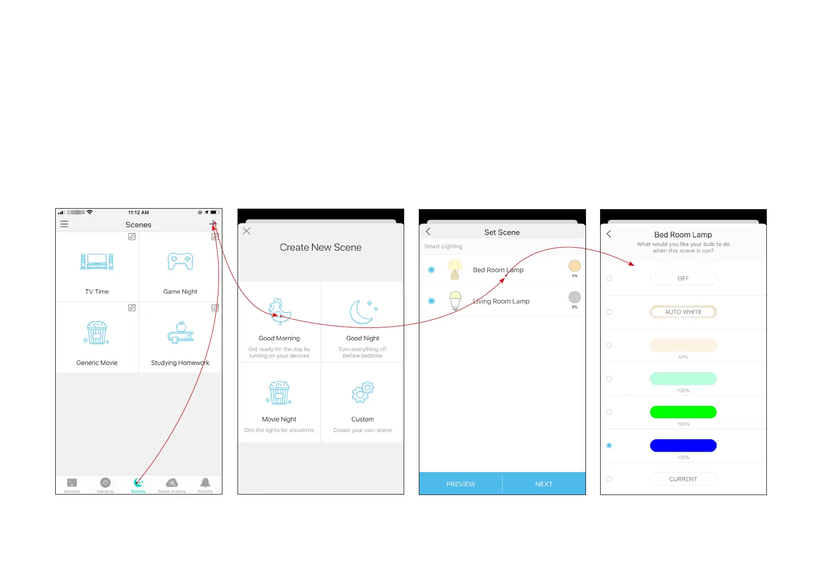A scene is a preset group of smart devices that can be customized and activated simultaneously at the touch of a button from your smartphone or
