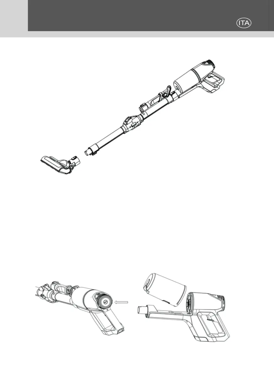 Collegare il manico alla spazzola allineando i due perni bloccandoli nella fes-