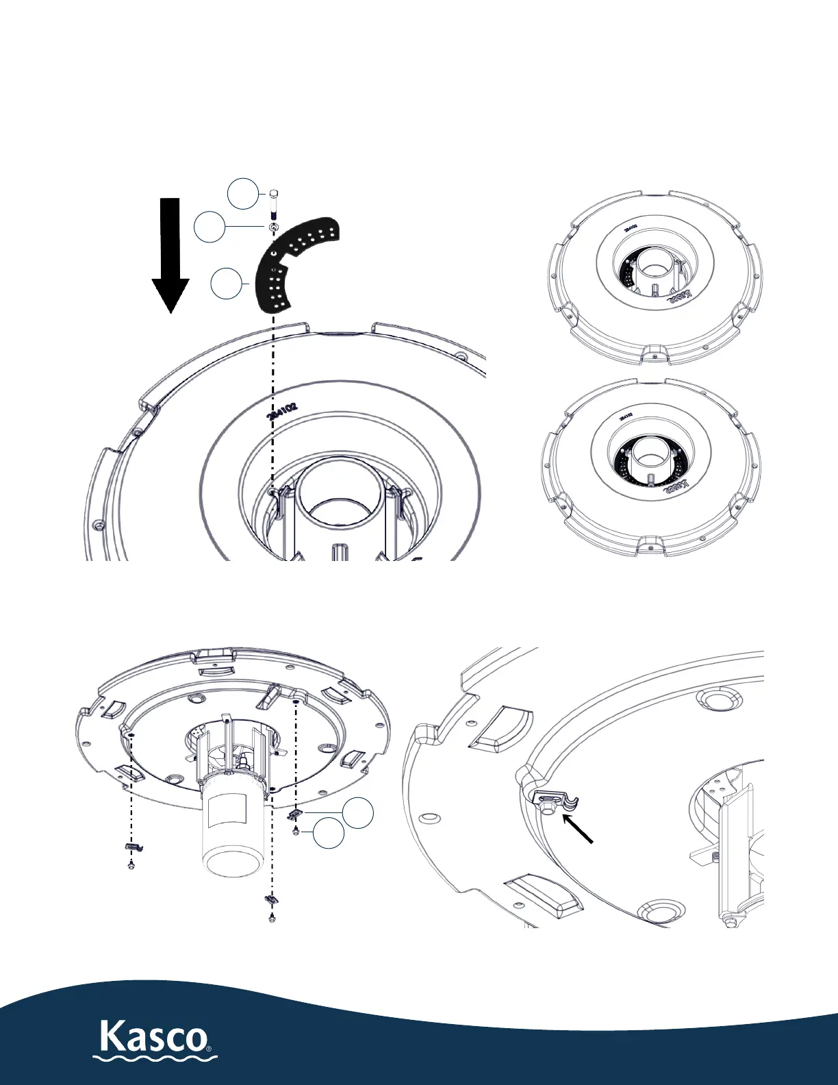 4. On the underside of the oat, line up the (3) bottom screen clips (J) and start threading in the (3) 3/8”-16