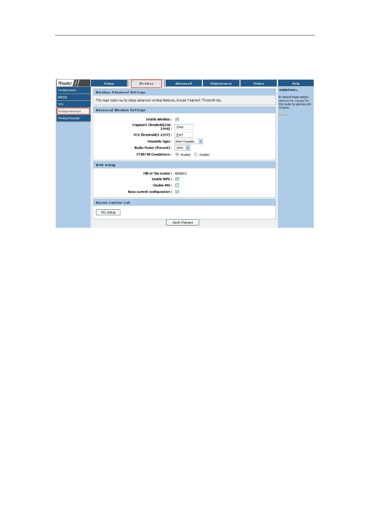 Choose menu “Wireless → Wireless Advanced”, you can configure the wireless advanced