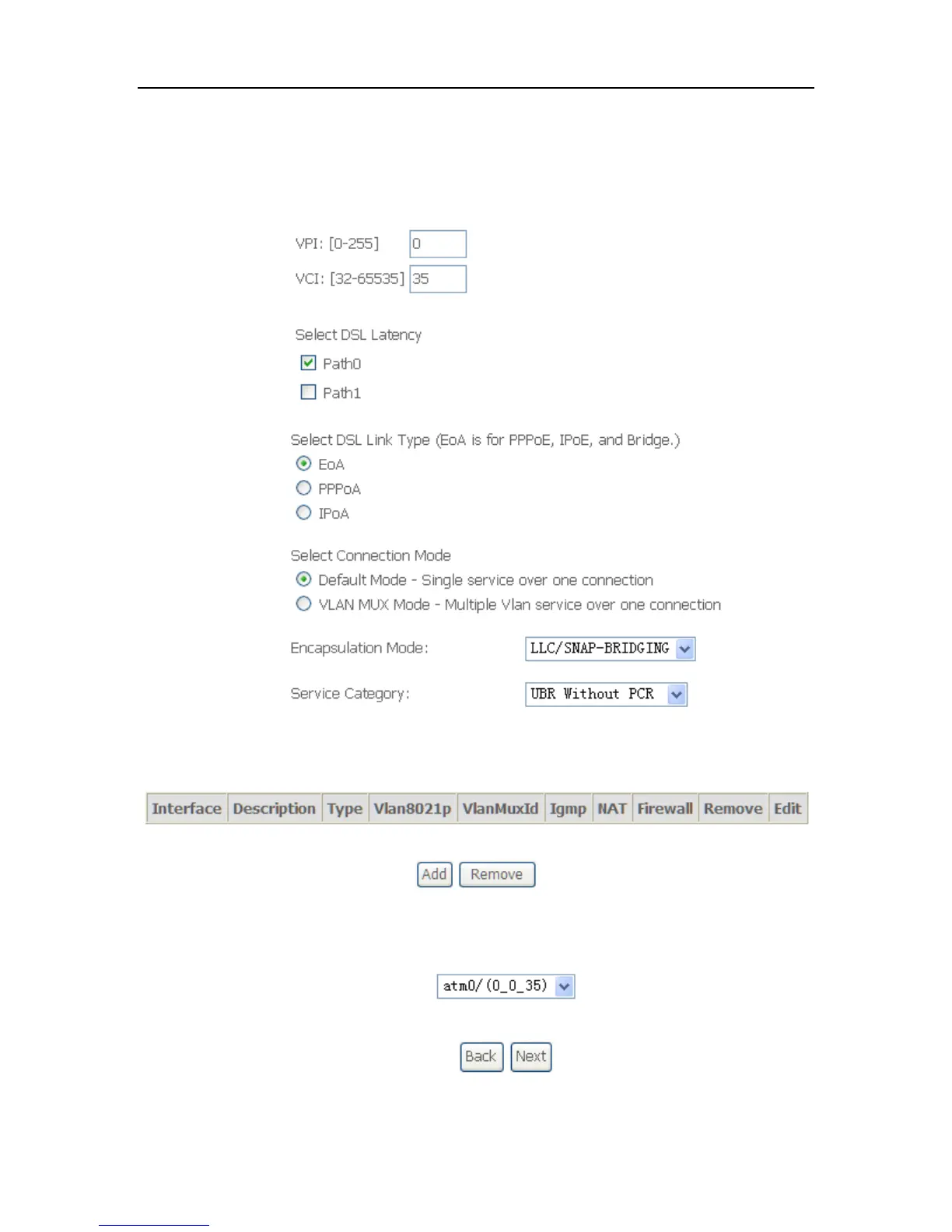 2. Click Add to configure PVC identifier, select DSL latency and select connection