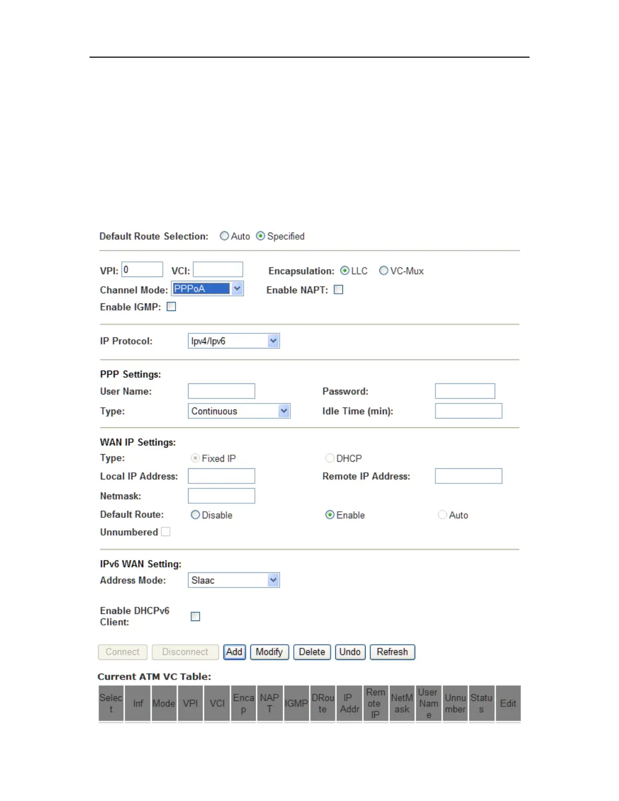 Select PPP over ATM (PPPoA) as Channel Mode and VC-Mux as encapsulation mode.