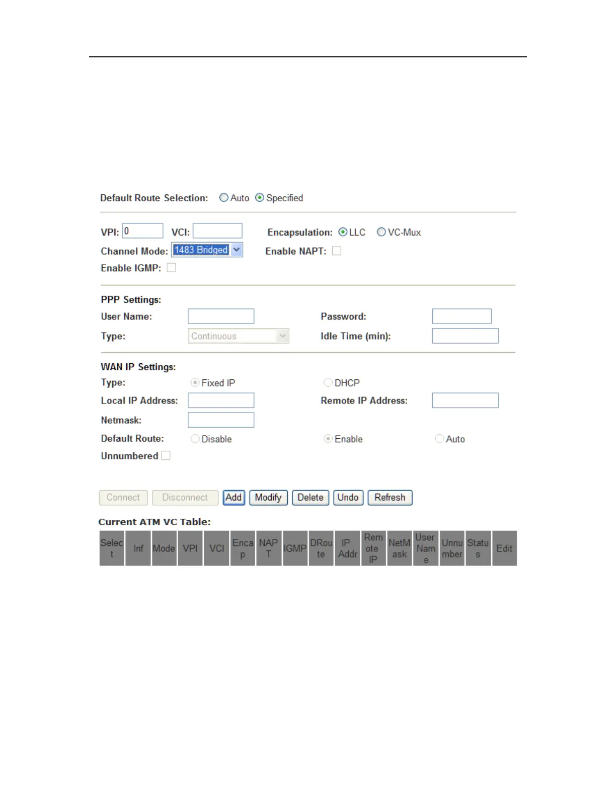 with the ISP. Enter VPI and VCI according to your local region and select the appropriate