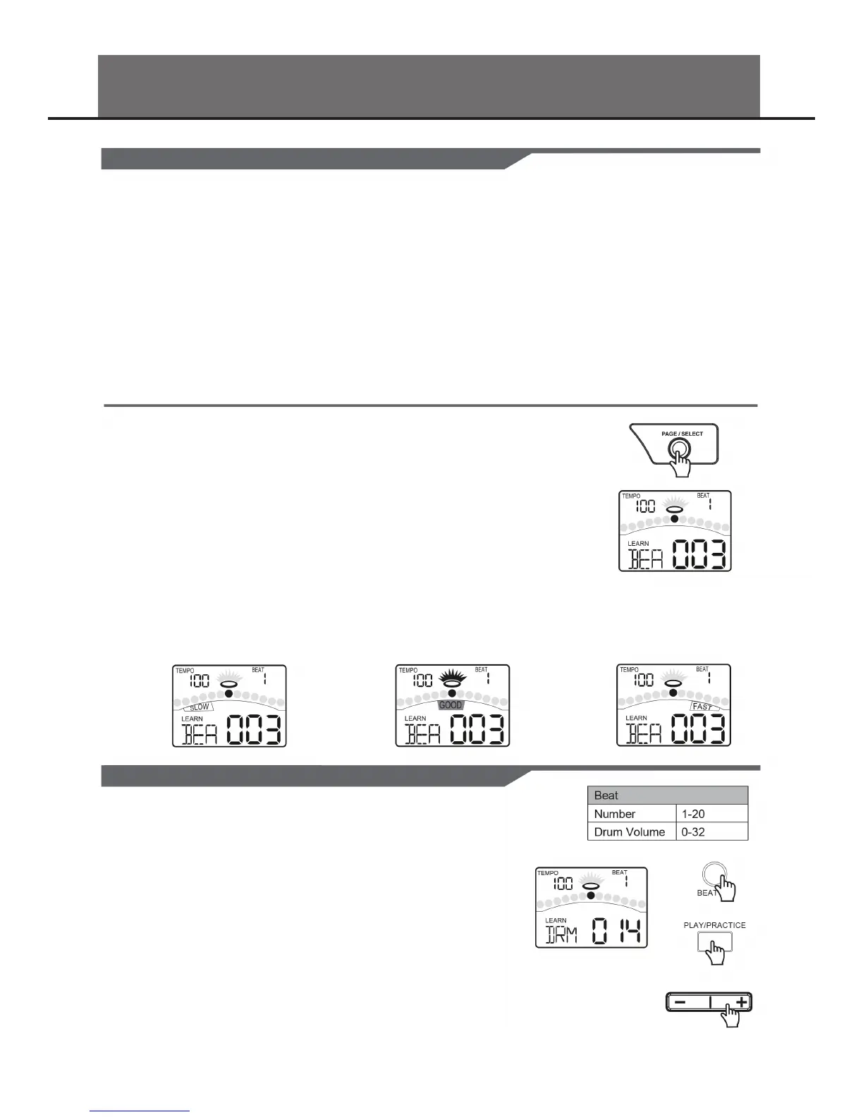 Press the [ - ] or [ + ] button to adjust the drum volume of the beat.