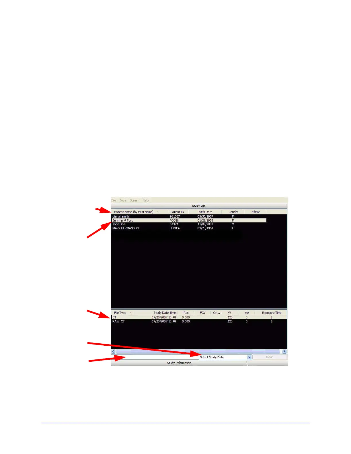 displayed. The Study List (shown below) lists all Patients that were