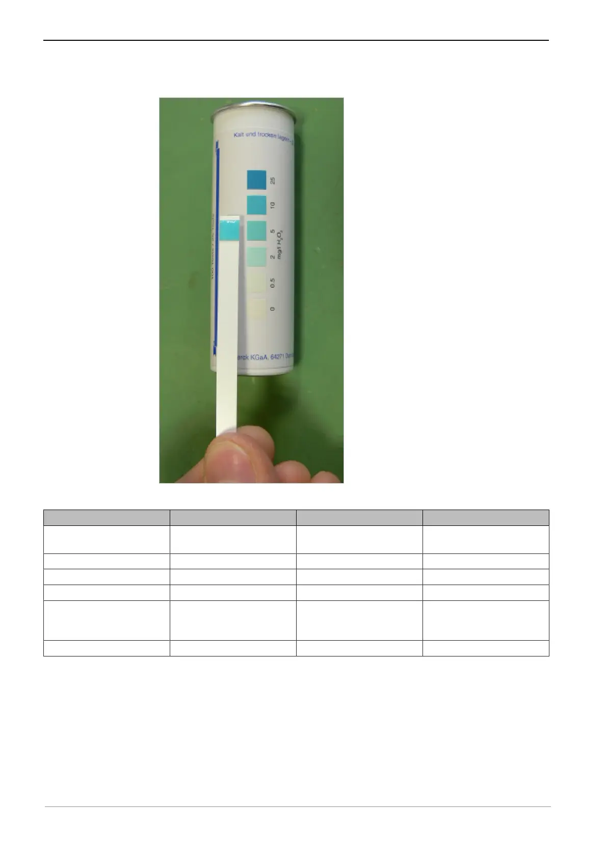 H2O2 concentration Measuring cup Ratio water : treated water Value shown on test strip