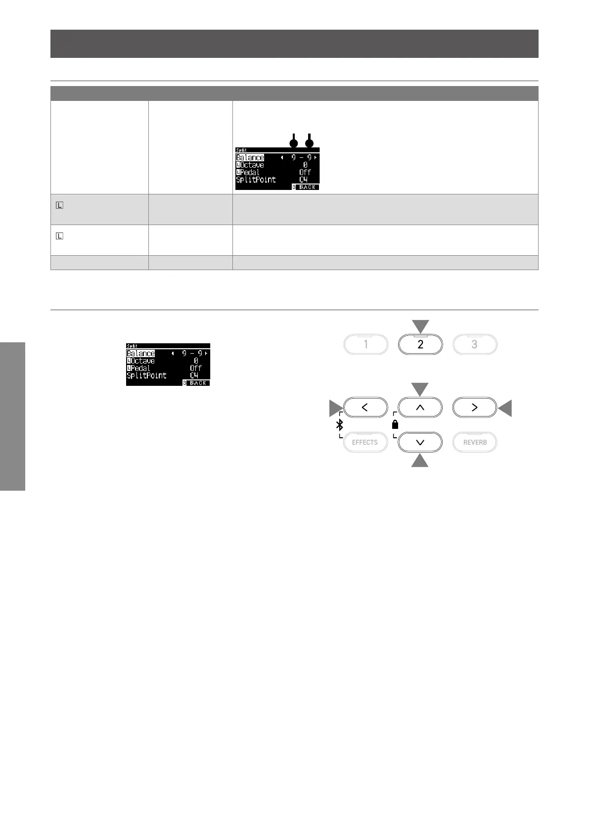 0 Adjust the sound range of the lower section in Split between 0 and +3 octaves.
