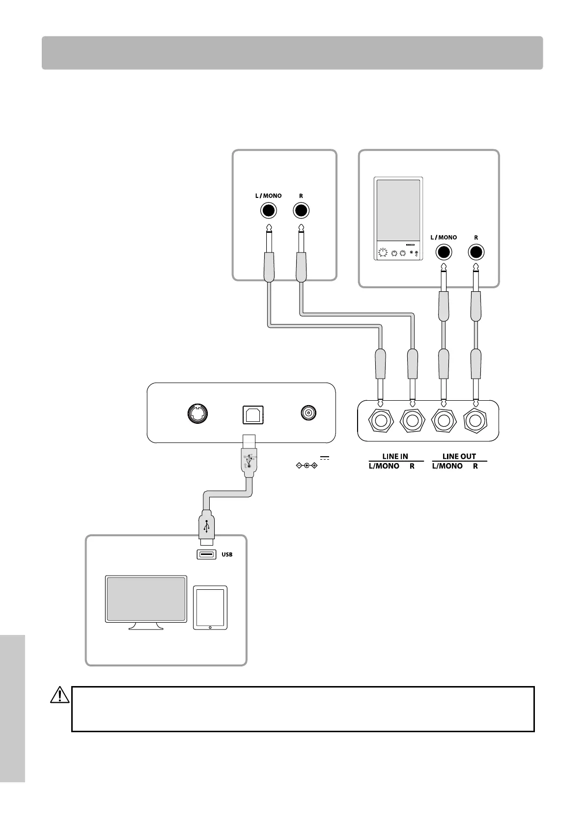 player, tablet, or a secondary keyboard, to the instrument’s amplier and speaker system. The illustration