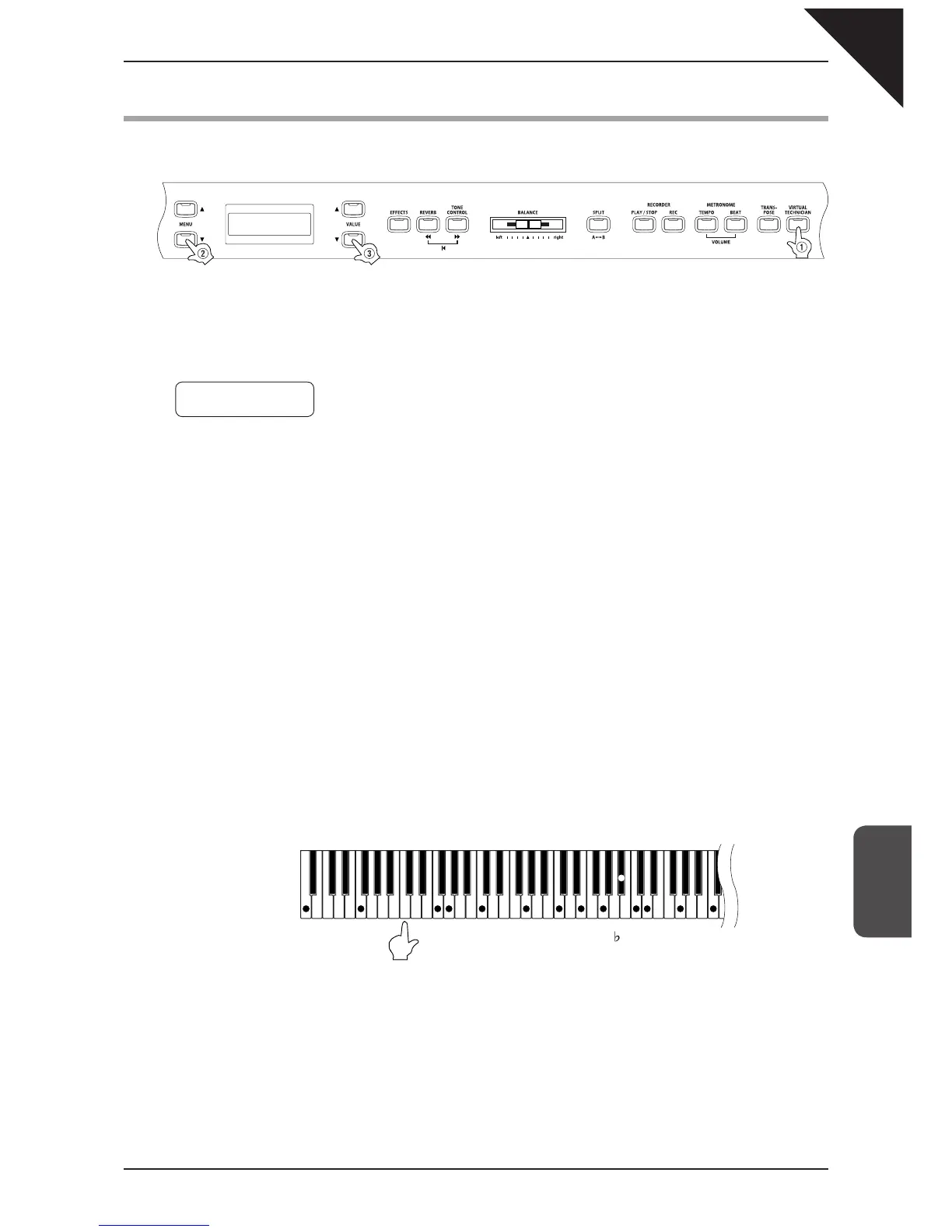 After setting the desired string resonance volume, you can exit the virtual technician function by pressing