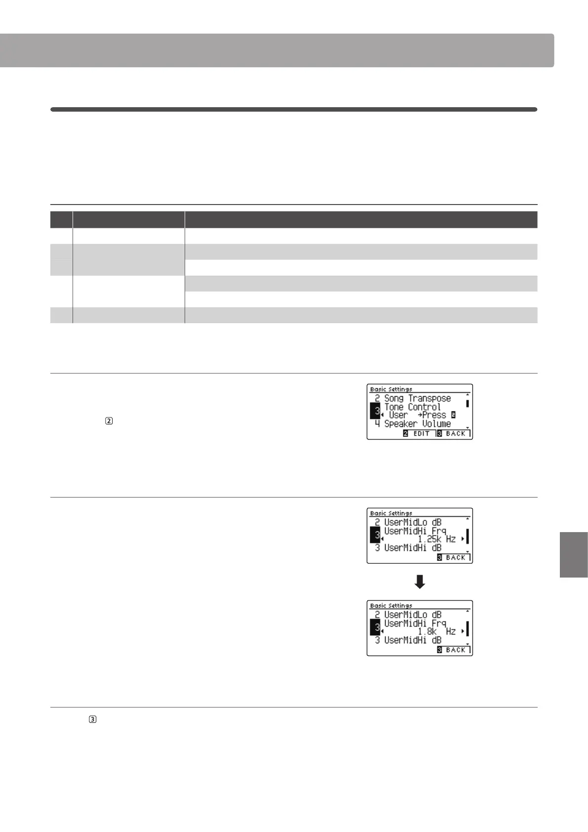 The User Tone Control screen will be shown in the LCD display.