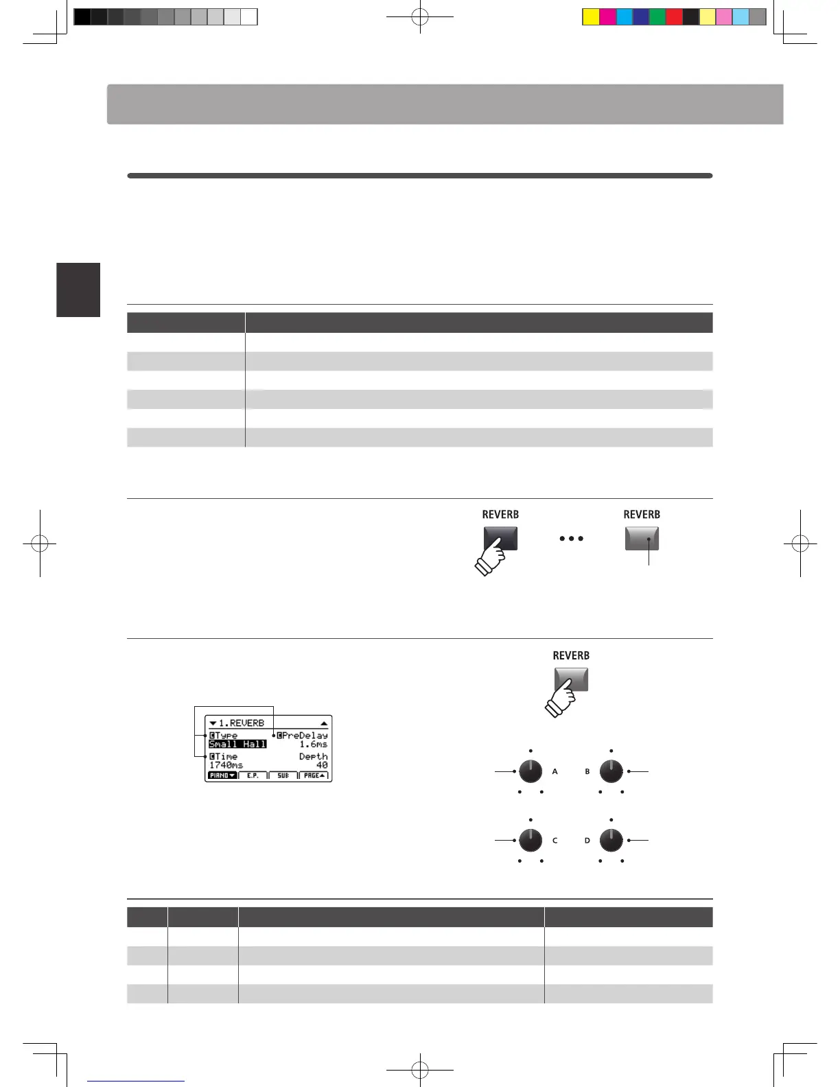 Turn the four control knobs (A, B, C, D) to change the reverb type