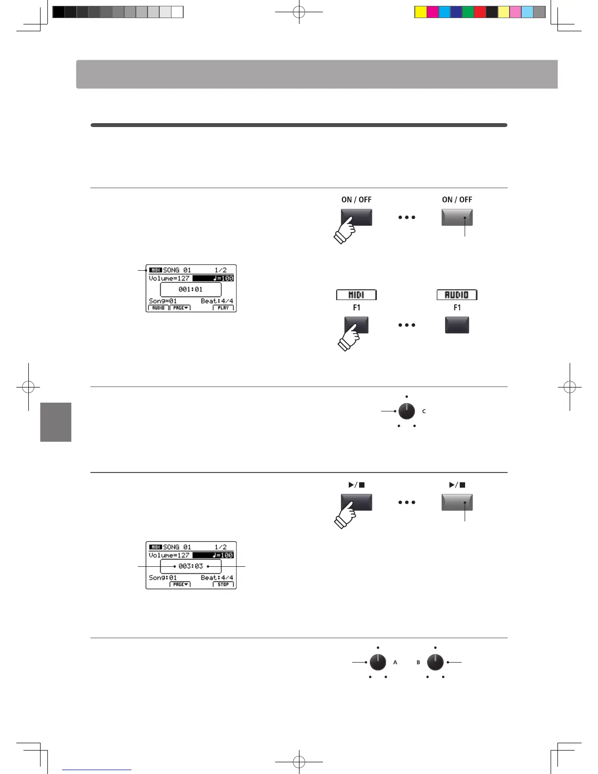 If a USB memory device is connected, press the F1 button (MIDI) to