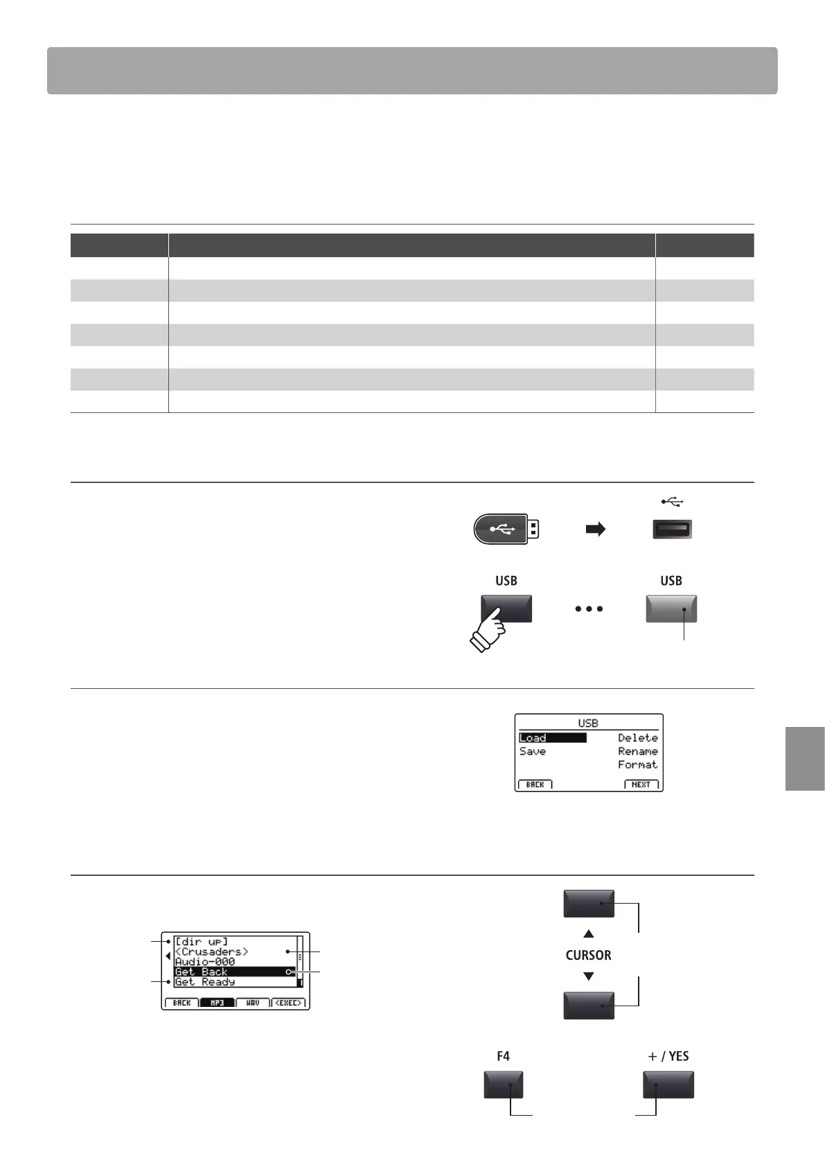The USB Menu contains functions to load, save, delete, and rename the various types of MP11SE data stored on a