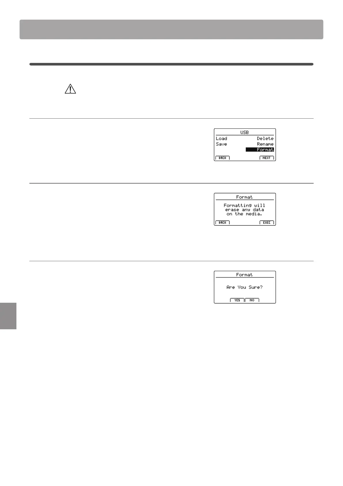 This function allows a USB memory device to be formatted, erasing all stored data.