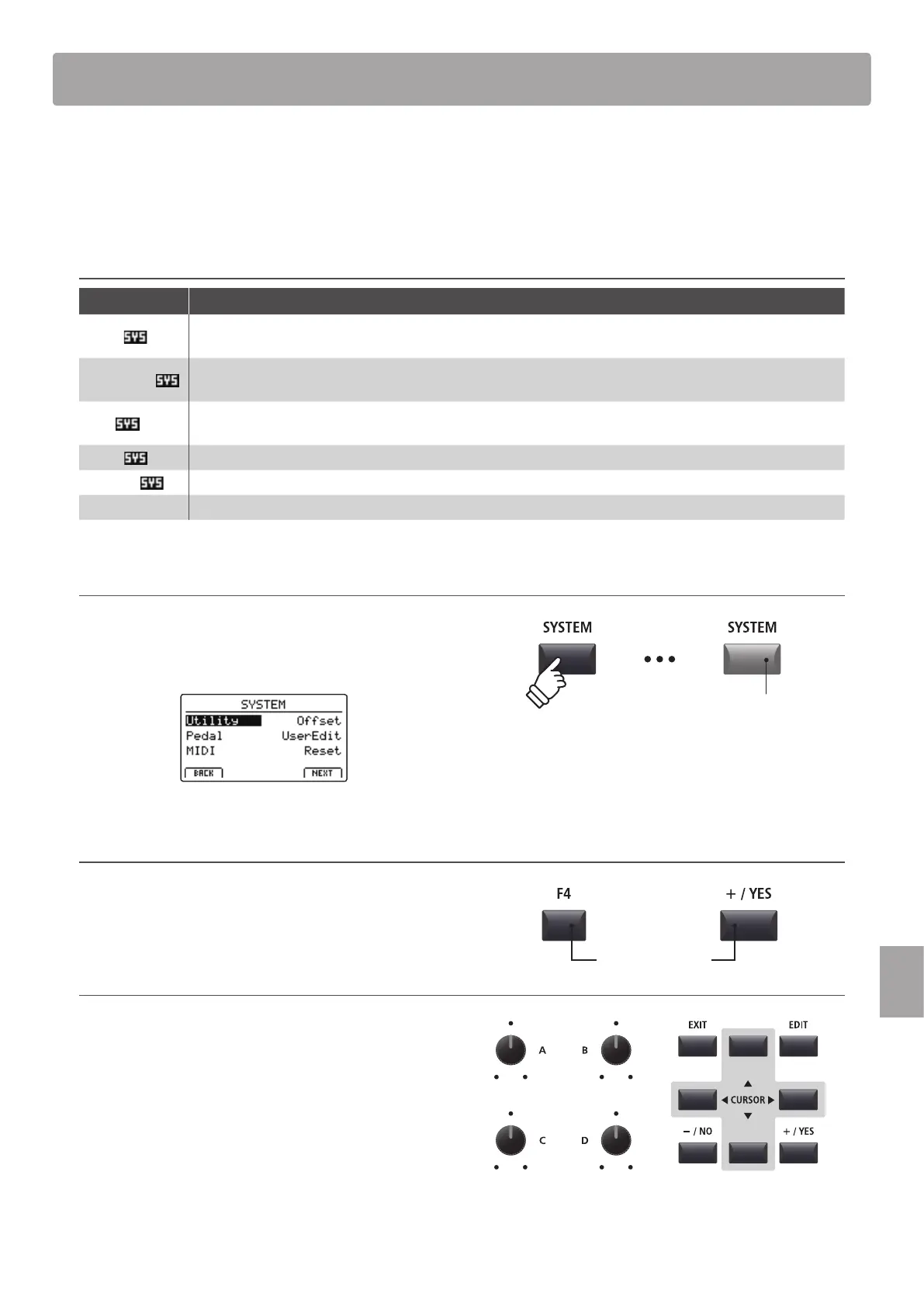 settings are grouped into six categories: Utility, Pedal, MIDI, Oset, User Edit, and Reset. SYSTEM parameters will