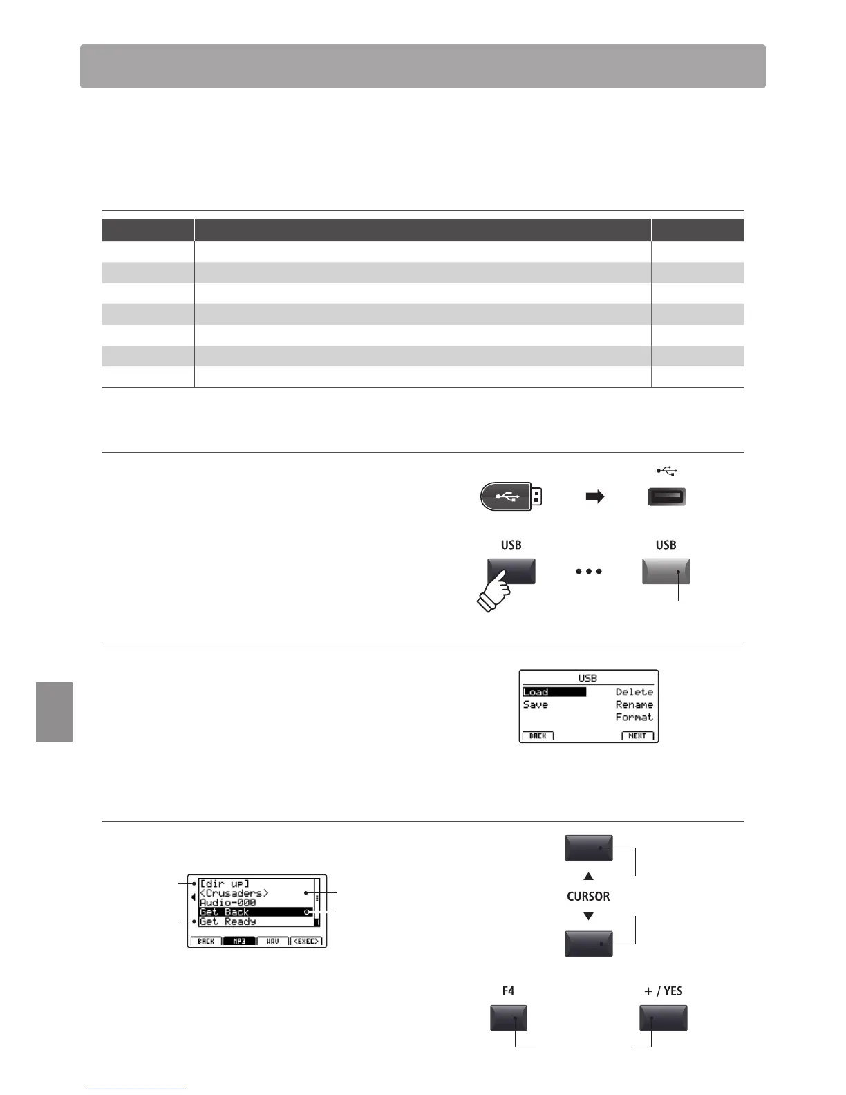The USB Menu contains functions to load, save, delete, and rename the various types of MP7 data stored on a USB
